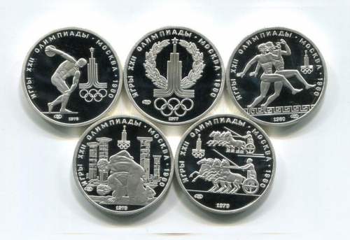 В рамках подготовки к XXII летним Олимпийским играм 1980 года в Москве, впервые в СССР были выпущены монеты из платины. В 1977-1980 было отчеканено 5 памятных монет на олимпийскую тематику (аверс — герб СССР и номинал монеты 150 рублей, реверс — фрагменты Античных Олимпийских игр) тиражами от 12 до 24 тысяч шт. каждая, в двух вариантах — proof и uncirculated.