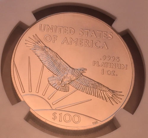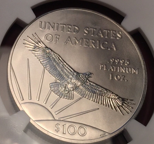 Аверс: Изображен орел в полете на фоне восходящего из-за линии горизонта солнца и его лучей. Сверху стоит надпись в две строки: «UNITED STATES OF AMERICA» (Соединенные Штаты Америки). Справа сверху от орла находятся следующие обозначения в три строки: «.9995 PLATINUM 1 OZ.» (проба 0.9995, платина, 1 унция). На стилизованном изображении земли внизу стоит информация о номинале: «$100» (100 долларов).