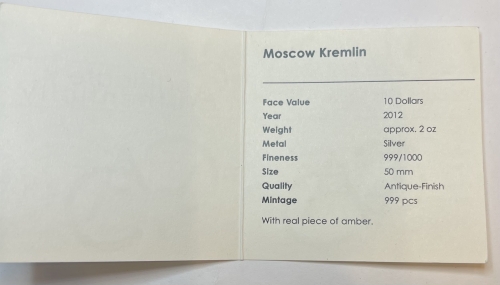 Серебряная монета 10 долларов "Московский Кремль" 2012 год, Республика Палау, 62,2 г., Ag 999