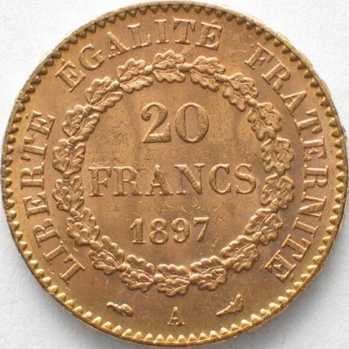 Золотая монета 20 франков Франция, Au 900, 6,45 г